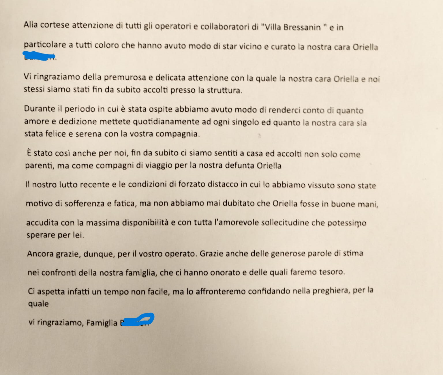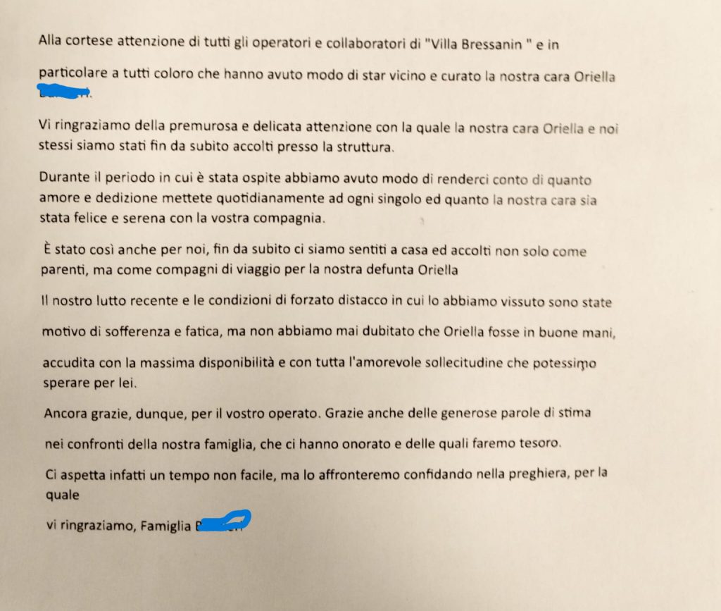 Villa Bressanin, i ringraziamenti dei familiari di una nostra ospite