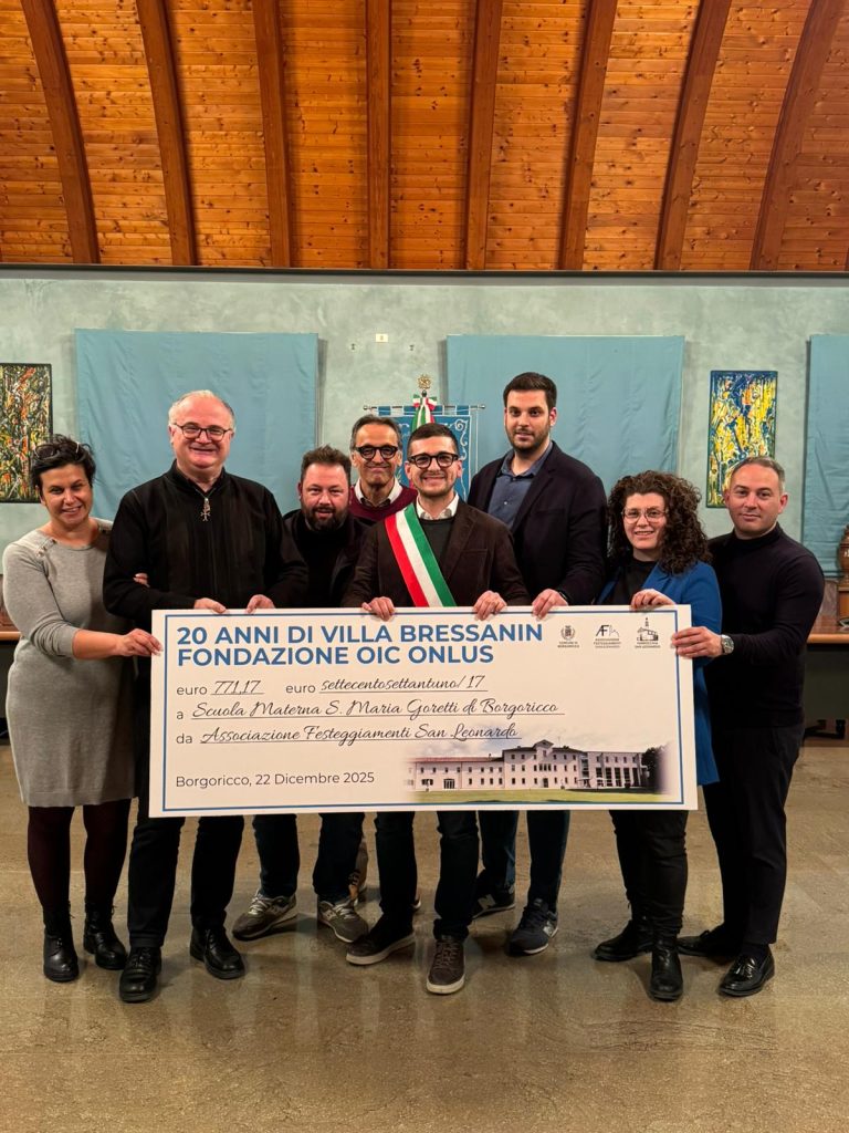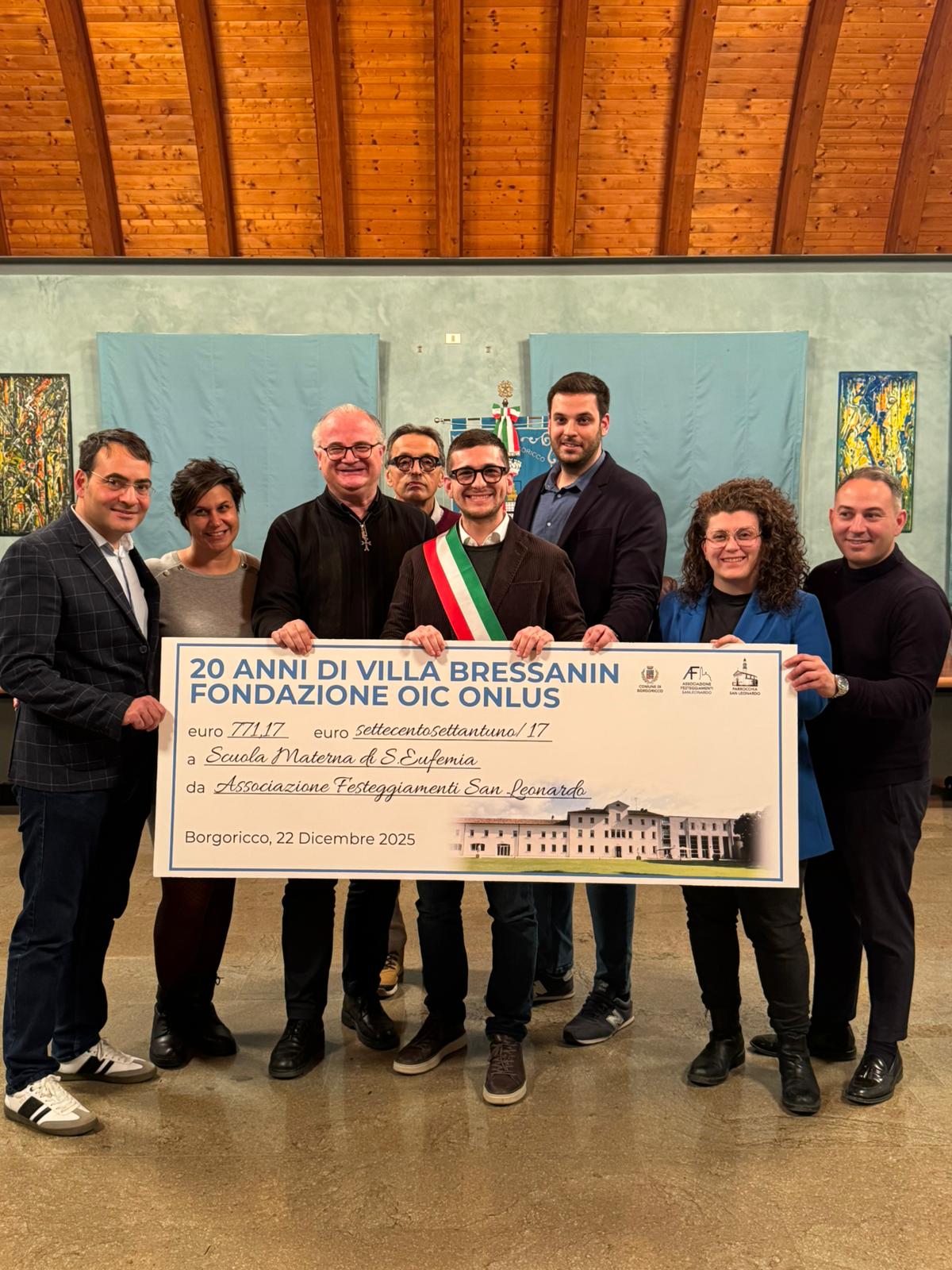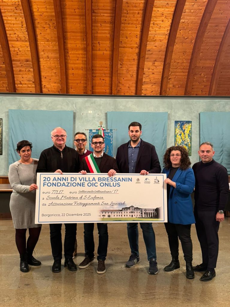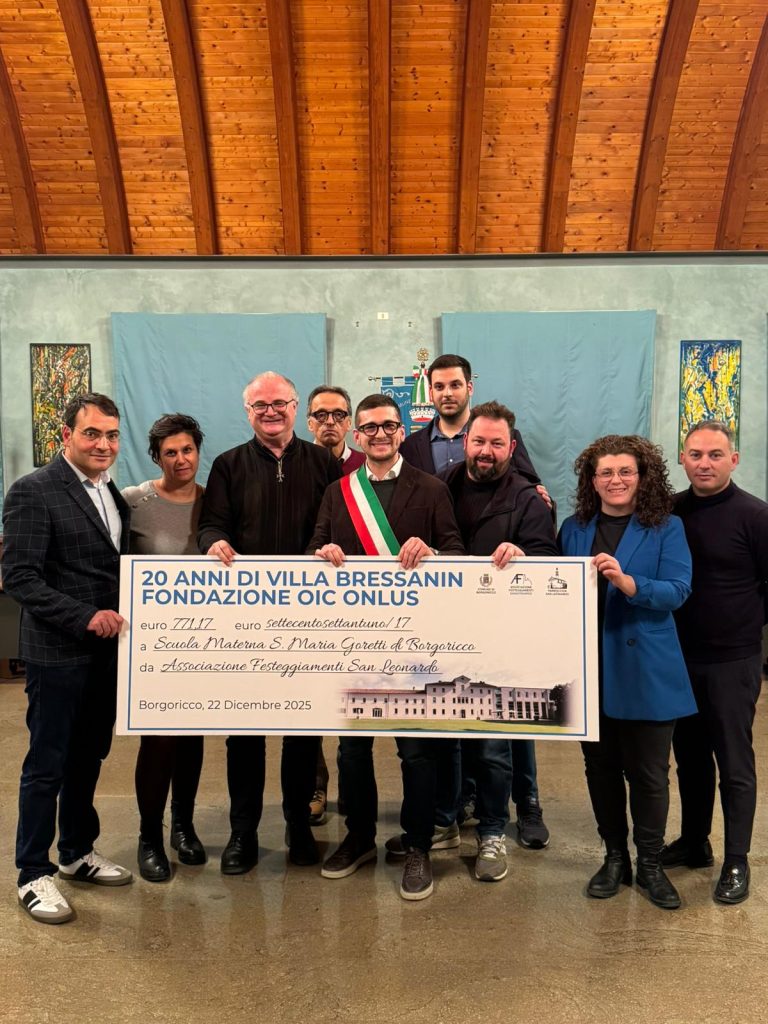 Si è tenuta ieri presso la Sala Consiliare del Comune di Borgoricco una cerimonia di ringraziamento, voluta dall’Amministrazione Comunale, per formalizzare la consegna del ricavato della Festa al Parco – per i 20 anni di Villa Bressanin data in gestione alla Fondazione OIC Onlus nel 2005 a seguito di una importante ristrutturazione. Con l’occasione il Sindaco di Borgoricco Gianluca Pedron, insieme alla giunta, hanno consegnato agli asili presenti nel territorio comunale gli assegni simbolici e le targhe di ringraziamento a tutte le associazioni e realtà che in diverso modo hanno contribuito alla realizzazione dell’evento che si è tenuto il 30 agosto u.s. Presenti per la Fondazione OIC Onlus il direttore del Centro Servizi Antonino Pettina e l’educatrice Chiara Zorzan. Per la parrocchia San Leonardo don Giovanni Bortignon. L’evento è stato un esempio concreto di coesione sociale con le realtà del territorio e la Fondazione OIC.
