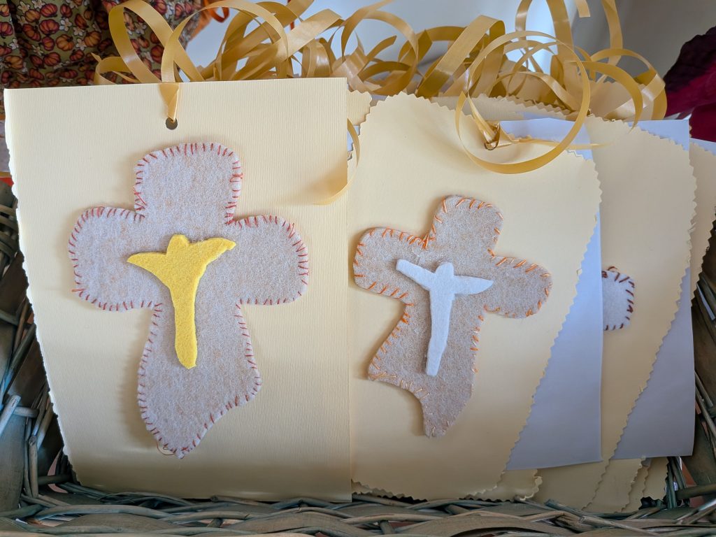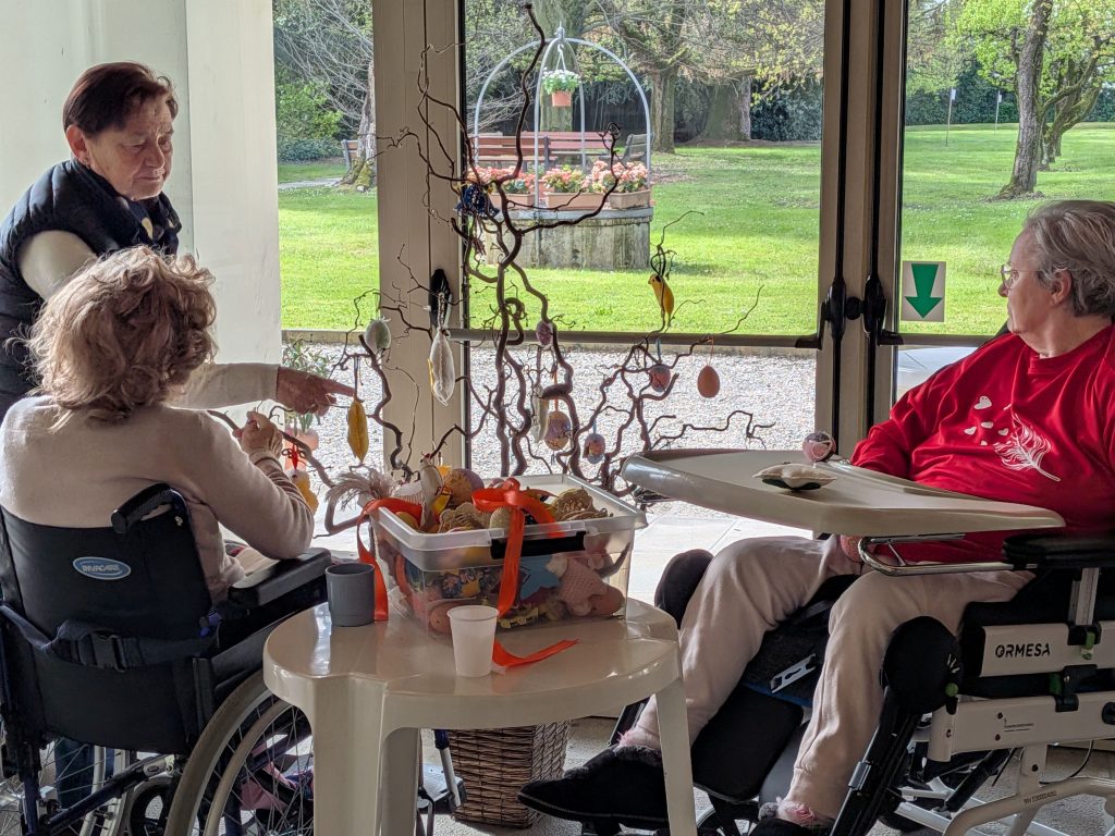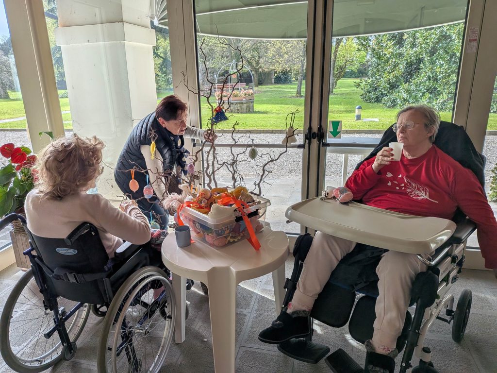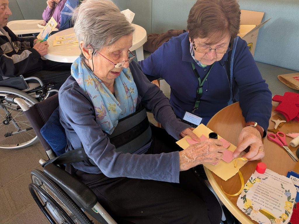 A Villa Bressanin di Borgoricco – Fondazione OIC Onlus – Pasqua 2026 appena passata ha visto i residenti impegnati a creare dei biglietti per tutti coloro che venivano a trovarli, con delle croci cucite. Questi lavori artigianali e occupazionali aiutano a mantenere abilità oculo manuali ed orientamento oltre ad alimentare l’autostima perché ancora si riesce a realizzare degli oggetti che oltretutto hanno anche una finalità concreta. Anche agli ospiti è arrivata una sorpresa… un coniglietto di peluche con degli ovetti di cioccolata.